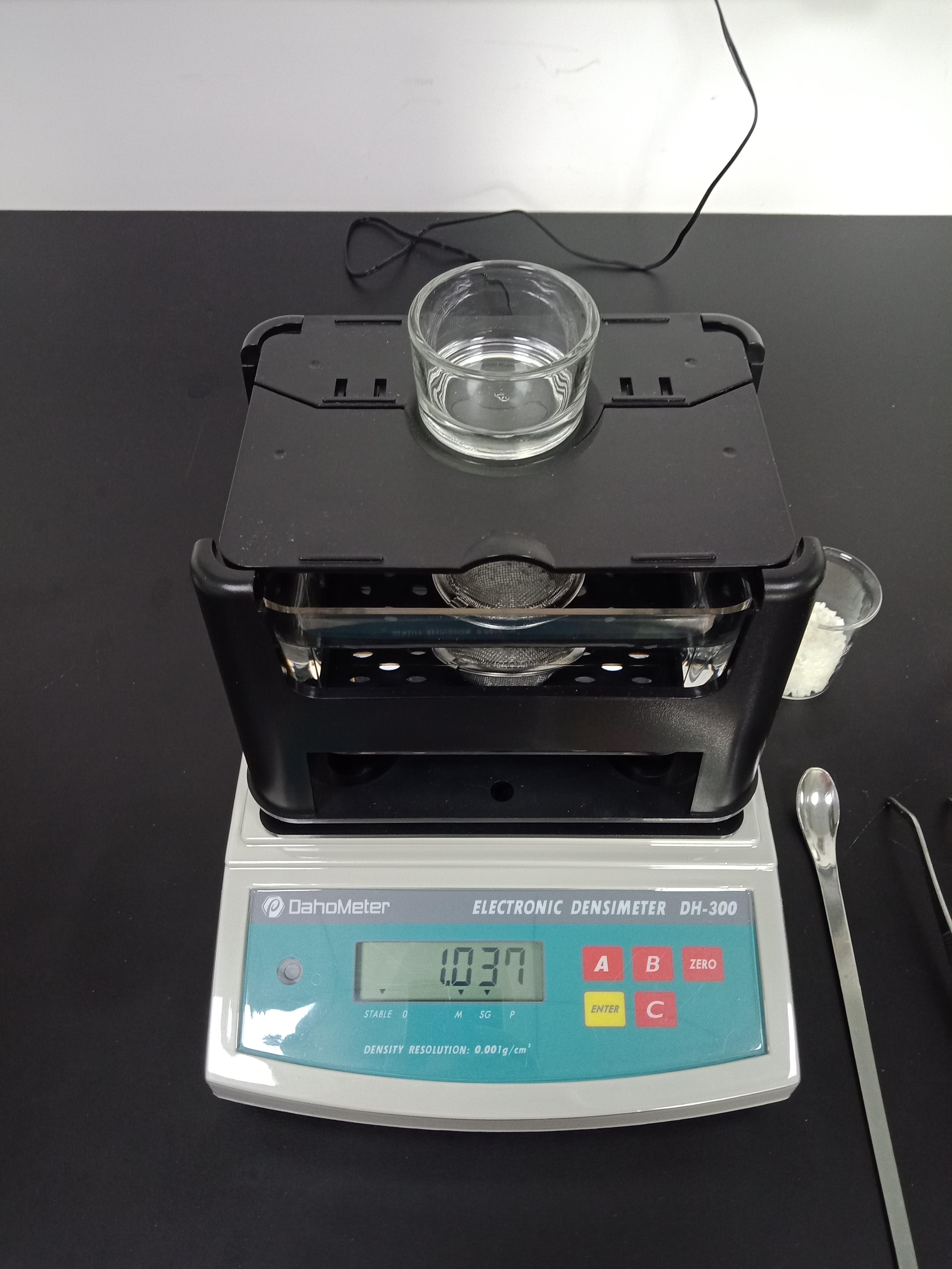6,測試結束后,按【ENTER】鍵退出,把測試樣品從小網球中倒出,再放回儀器水中吊籃,小玻璃杯放回測量臺上,等待下次測試。