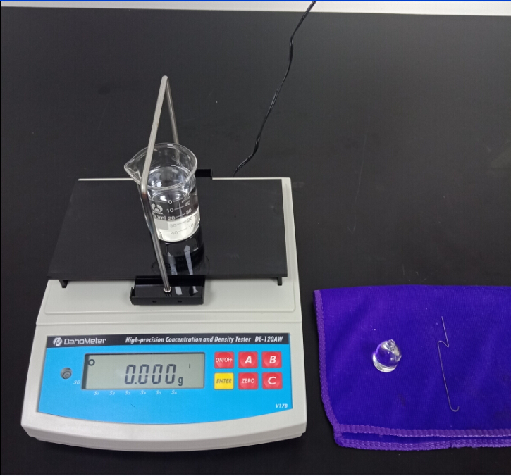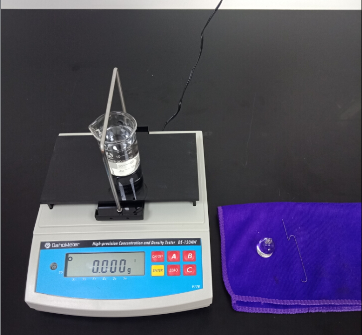 1,準備一杯50ml常溫的純凈水,測試用玻璃砝碼一個,掛鉤一個;