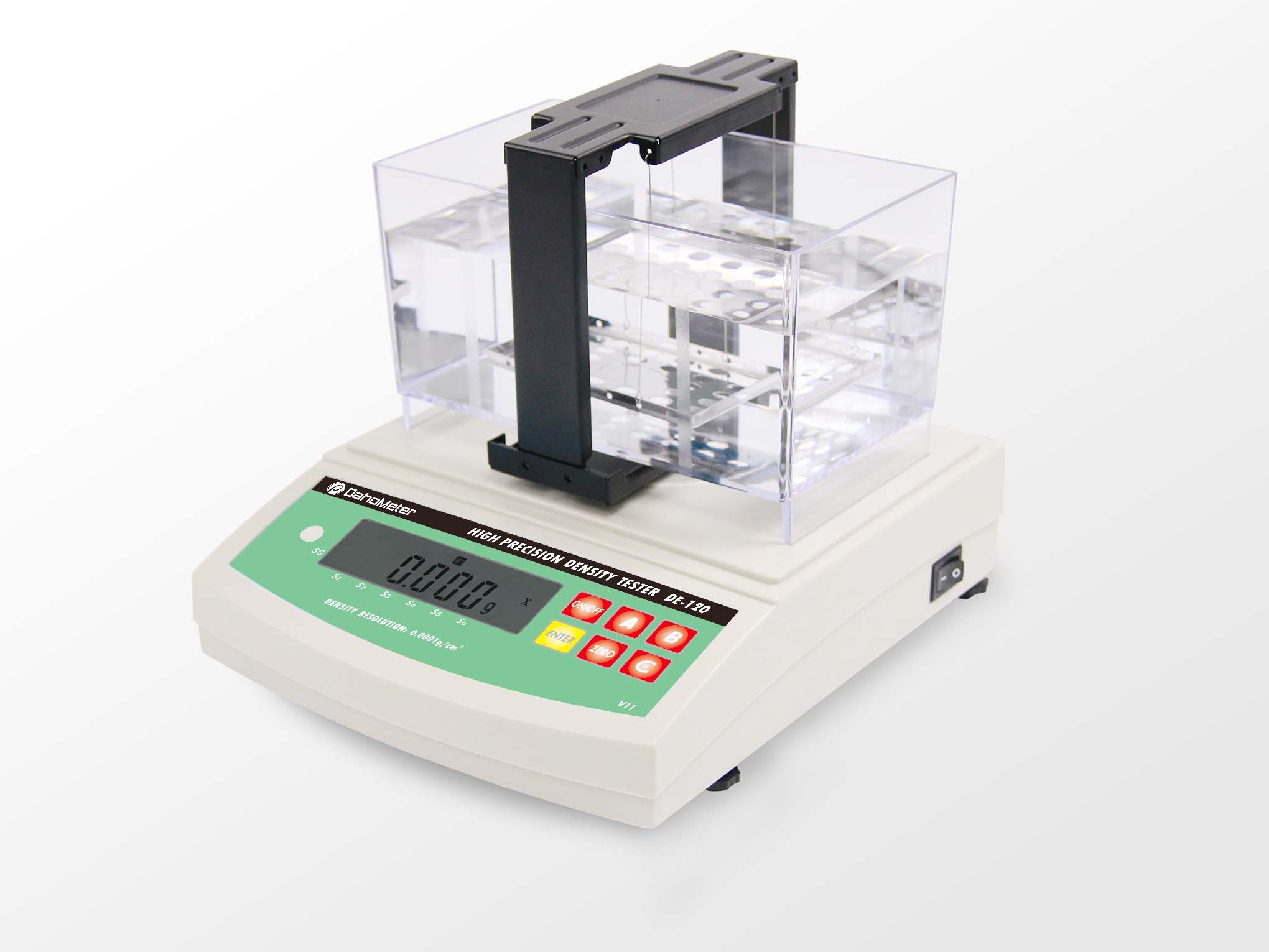 第一步:將測(cè)試樣品放在儀器測(cè)量架上稱量空氣中的重量,待重量穩(wěn)定后,按ENTER鍵,儀器記錄重量數(shù)據(jù);