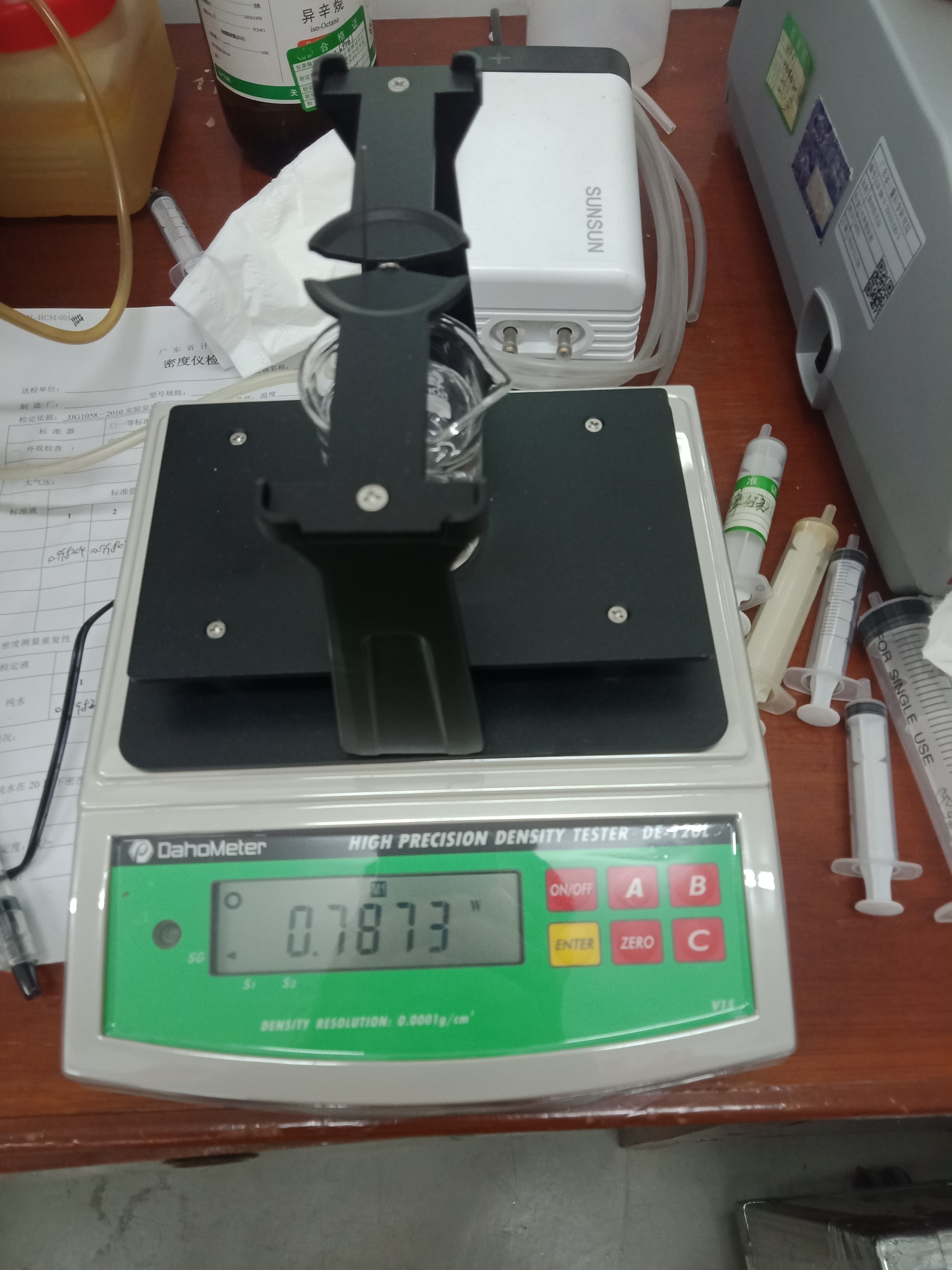 上圖是廣東省計量科學研究院液體密度測試儀器與東莞宏拓DE-120L液體密度測試儀的無水乙醇密度測試結果對比,左圖儀器是廣東省計量科學研究院液體密度測試儀,右圖儀器是東莞宏拓DE-120L液體密度測試儀。